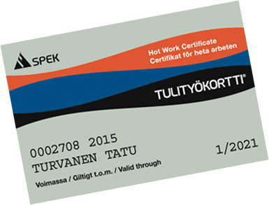 Korttikoulutukset: Tulityö-, työturvallisuus-, ensiapu-, alkusammutus- sekä hoitolaitosten turvakorttikurssit.